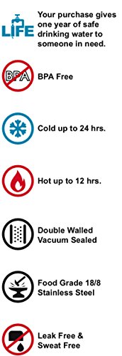 COLD UP TO 24 HOURS and HOT UP TO 12 HOURS: Made of 18/8 food grade double walled vacuum insulated stainless steel. This is a leak proof bottle that won't sweat with cold drinks on a hot day or burn you with hot tea or coffee inside.