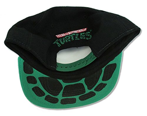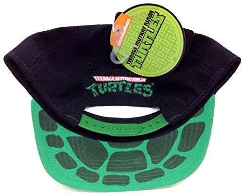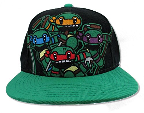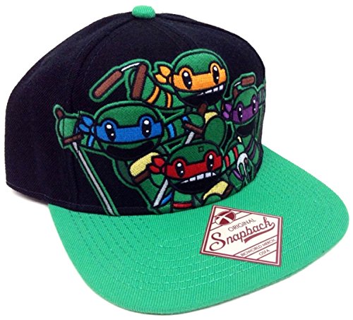 Studio : na Publisher : na Binding : Apparel Product Description Black Animigos Teenage Mutant Ninja Turtles Snapback. Cap Design features artwork of the group in front of TMNT text. Black Crown, Green Bill. TMNT Logo embroidered on the back panel, turtle shell printed under the bill. 0