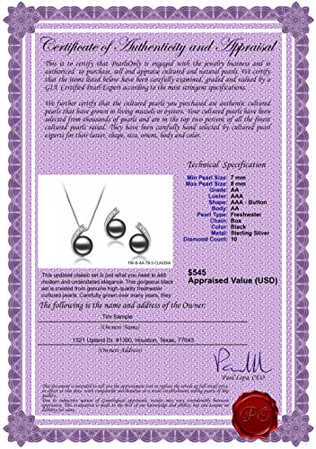 -. Feature : Included FREE with your cultured pearls set is an Appraisal Certificate prepared by a Pearl Expert describing in detail your set size, color and body shape. A color picture of your set is shown on each certificate to ensure carefree insurance claims should those ever arise. It is a wonderful keepsake that shows you truly care. / Create a WOW! Experience with a FREE matching gift box. Our boxes are exclusively designed for PearlsOnly to gently hold your cultured pearl set during shipping and also to be breathtaking when your cultured pearl set is unwrapped and opened. With a focus on detail and elegance, the overall packaging from outside wrapping to inside, creates an unforgettable opening experience. / Easily care for your cultured pearls set, with a FREE silky storage pouch to protect your cultured pearls set when you are not wearing it. Although cultured pearls are very easy to take care off, we do include a FREE Pearl Care Card, so that you can easily know how to best take care of your cultured pearls set to keeps its value and beauty. / We want you to be 100% satisfied with your purchase and that is why we offer 30-day returns on all of your purchases. Returns are easy and should you need to return or exchange an item, our customer care team is ready to assist you around the clock. And with a huge selection of Freshwater Cultured Pearls, Japanese Akoya Cultured Pearls, Saltwater Cultured Pearls, Tahitian Cultured Pearls and South Sea Cultured Pearls you can find so many things to suit your taste.