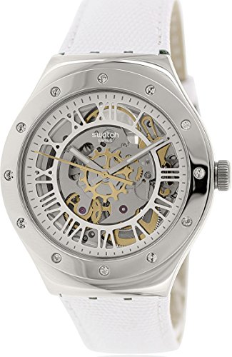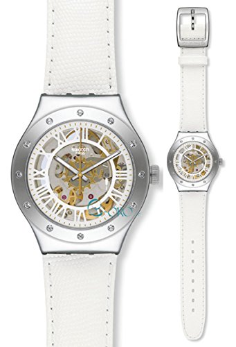 -. Title : Swatch YAS109 Rosetta Bianca Silver White Glitz Dial Leather Unisex Watch NEW