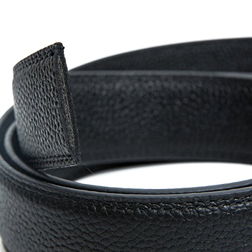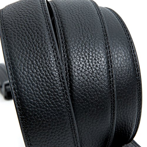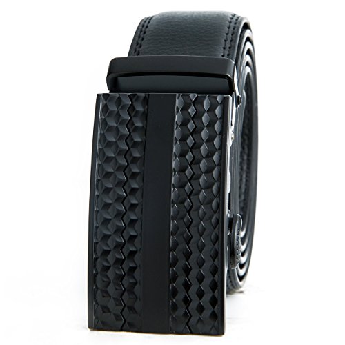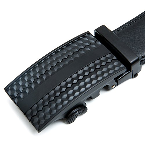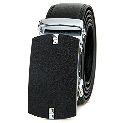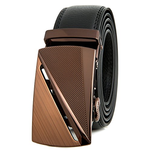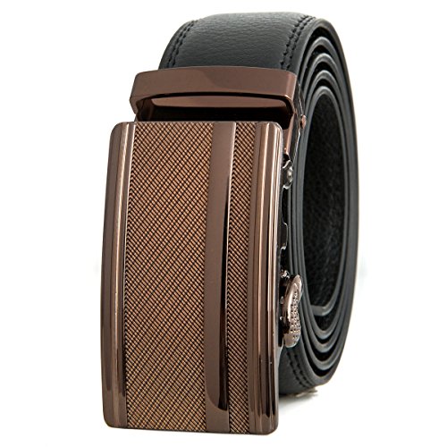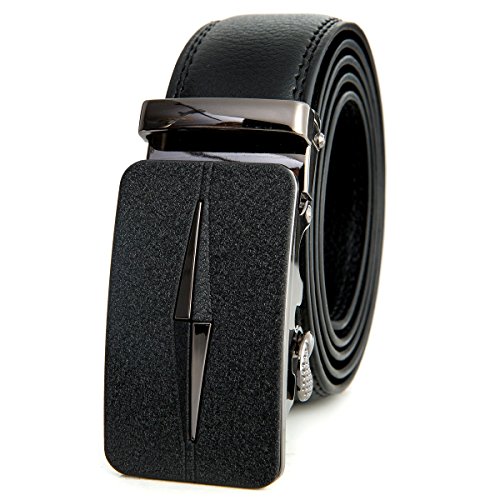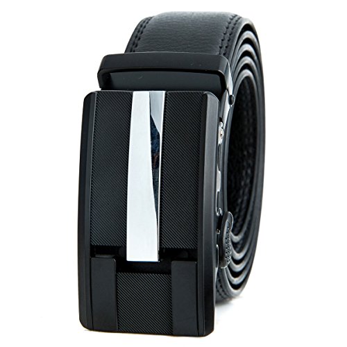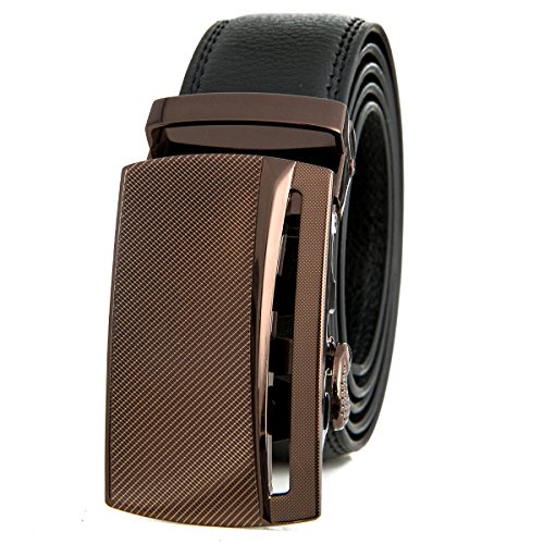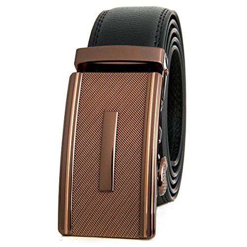 HIGHER IN QUALITY belt is made with high-quality Head layer cowhide concealed with fortifying polyurethane. They are crafted with fine leathers that breathe, repel moisture and age gracefully. Our sturdy, lightweight, scratch resistance slide belt buckles are made with Zinc Alloy to create a substance with greater strength and resistance to corrosion. SOLID MECHANISM Our state of the art features offers an effortless and efficient experience every time! The tip of the rachet belt inserts into the click belt buckle, where a locking mechanism holds the rachet belt in place on our unique tracking system and auto locks it from the back. To remove the slide belt, simply press the small metal lever on the bottom of the leather belt buckle, and get a smooth inaudible release!Feature