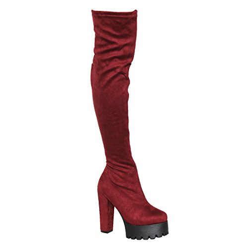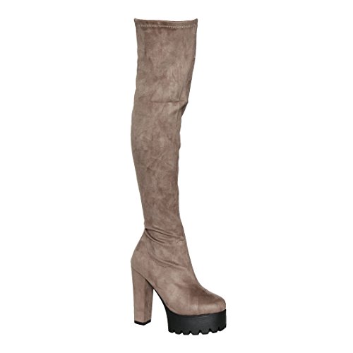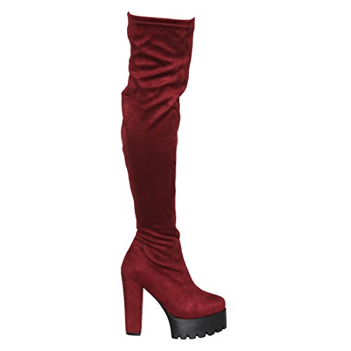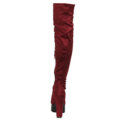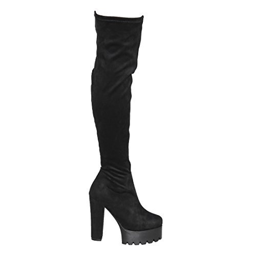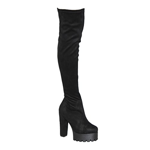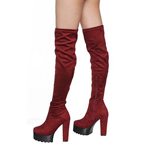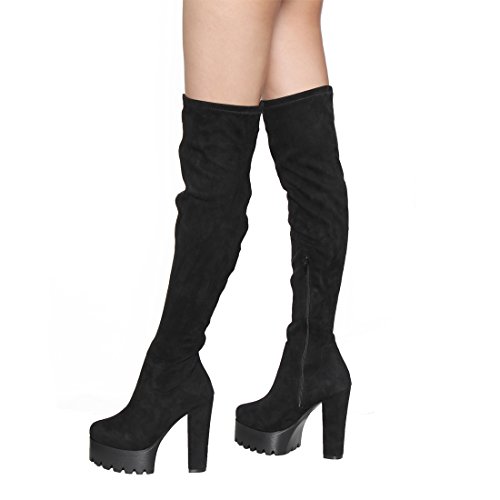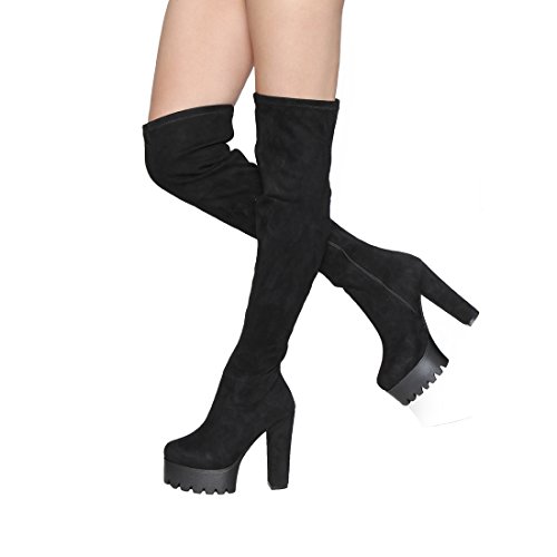 Binding : Apparel Product Description Love a look that will linger! Time to trend-set in the cutting edge lines of these over the knee thigh high boots.Finished with a faux suede plain upper,a stretchy snug fit constrution,a platform with lug sole design,a wrapped chunky block heel silhouette and a all day comfort smooth lining. 0