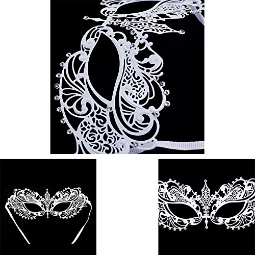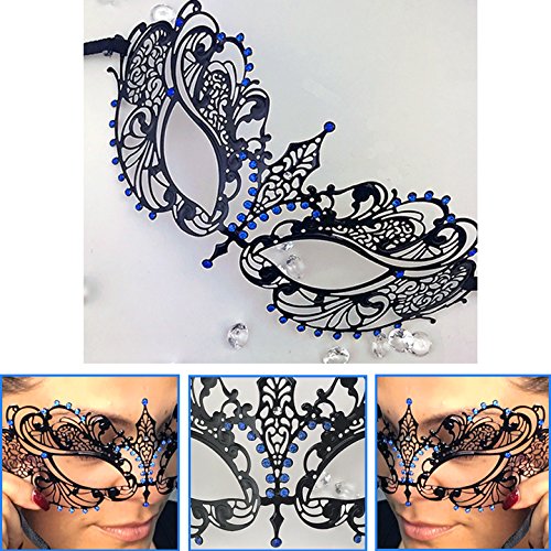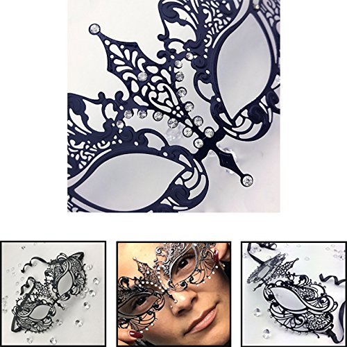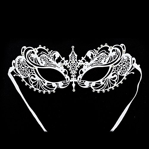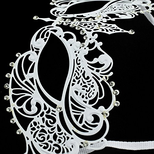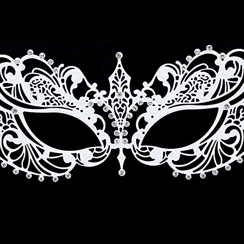 This laser cut metal mask is a great addition to any Halloween costume, masquerade party, or prom embellished with rhinestones, this mask can be gently bent to form to your face. This mask ties in the back with two soft matching ribbons. Measures approximately 8.25 inch x 3 inch, one size fits most.Feature