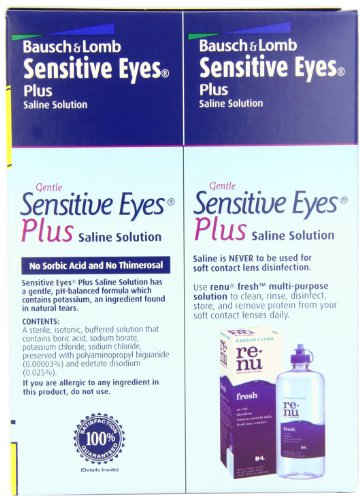 -. Binding : Health and Beauty -. Brand : Sensitive Eyes -. Feature : Use for rinsing after daily cleaning and before insertion / Safe for rinsing before or after heat, chemical, or hydrogen peroxide disinfection / Use for diluting enzymatic cleaning tablets and storing soft contact lenses after thermal disinfection / Note: This product does not disinfect or clean your contact lenses. We recommend renu sensitive multi-purpose solution to clean, rinse, disinfect and store your soft contact lenses -. Label : Sensitive Eyes -. Manufacturer : Sensitive Eyes -. Model : 620280 -. MPN : 620280 -. NumberOfItems : 8 -. PackageQuantity : 8 -. PartNumber : 620280 -. ProductGroup : Health and Beauty -. ProductTypeName : HEALTH_PERSONAL_CARE -. Publisher : Sensitive Eyes -. ReleaseDate : 2008-04-24 -. Studio : Sensitive Eyes -. Title : Sensitive Eyes Plus Saline Solution 24 Oz (Pack of 8)