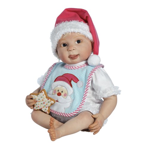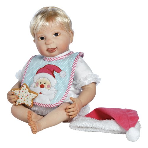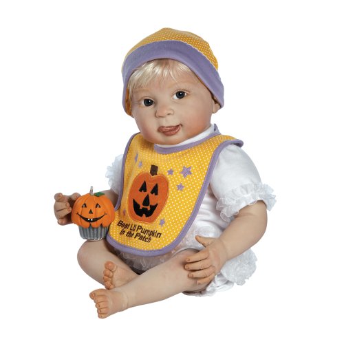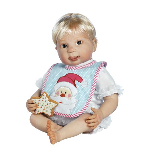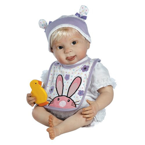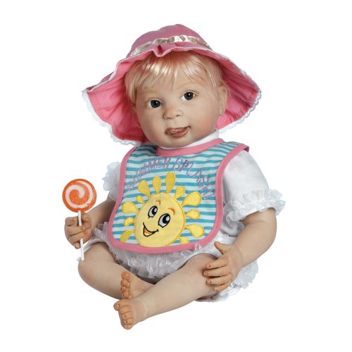 - Feature : Sculpted by famous doll artist Sherrri Williams / She is poseable and measures approximately 18 inches from head to toe and 11 inches when seated / Head and limbs were lovingly handcrafted in Flex-Touch Vinyl and comes with a weighted soft cloth body for a real baby feel with 3/4 Vinyl Arms and 3/4 Vinyl Legs / She has beautiful hand set deep blue eyes, hand painted details, hand applied eyelashes and gorgeous blonde hair / Ensemble includes - 1 white jersey knit tunic, 1 pair pantaloons accented with ruffled organzz detailing and 4 changeable themed bib outfits.