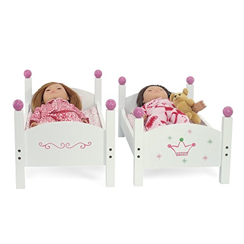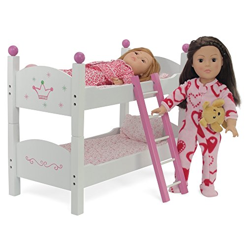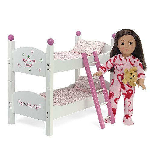 -. Feature : Made to fit 18 Inch dolls such as American Girl, Madame Alexander, Our Generation, etc. / High quality boutique style painted product - CPSIA safety tested and certified- white with Wish Crown theme (matching Wish Crown pieces available) / Bunk beds separate to two individual beds and are stackable (to a double and a single) with two sets, comes with extra bed post knobs for 2nd bed / Includes ladder, two pillows, two quilted blankets & two white mattresses / Comes flat packed in a plain brown box (no surP.R.Ise spoilers), easy 15 minute assembly with included illustrated instructions