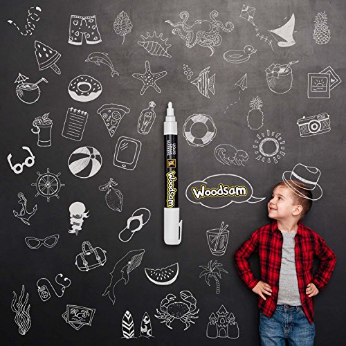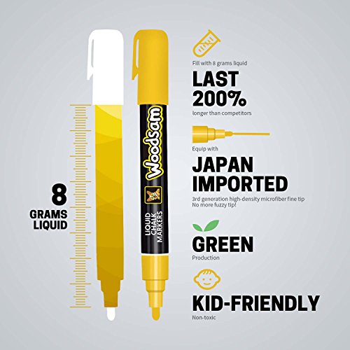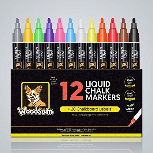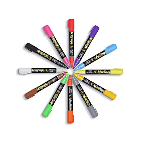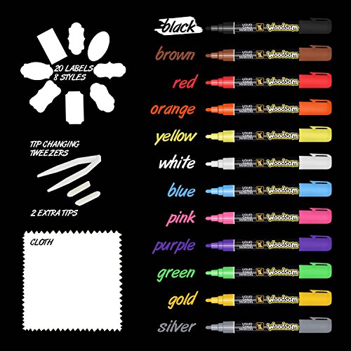 Woodsam Premium 12-Color Liquid Chalk Paint Markers - 6mm Microfiber Fine Tips – Bonus 20 Labels & 2 extra tips included
