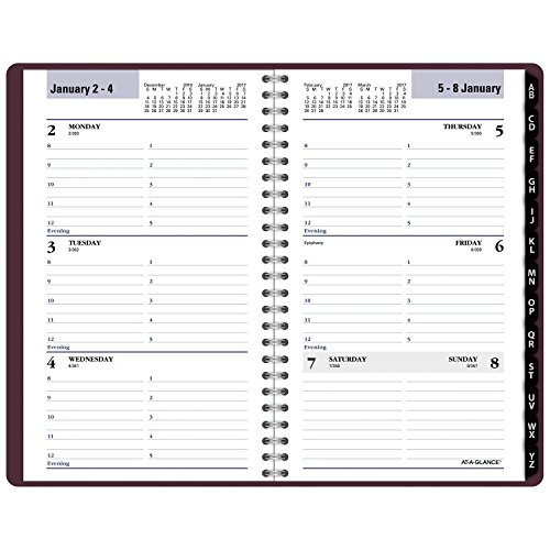 -. Feature : Weekly appointment book 12 months (January 2017 - December 2017); one week per two-page spread; hourly appointments, 8 a.m. - 5 p.m., Mon - Fri / Past, current and two future months reference; Julian dates; tabbed telephone/address section / P.R.Inted on quality paper containing 30% post-consumer waste. Please note color choice is not available to customer, the color will be selected at random for you.