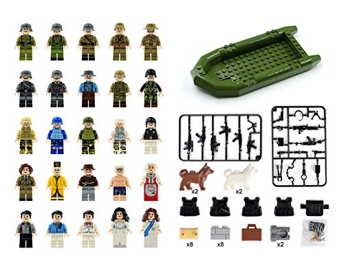 -. Title : 25-Piece Community People and Military Minifigures with a Set of Weapons and Speedboat Interchangeable Hats/Hair Legs Bodies - Tight Fit with Most Major Brands of Building Blocks - by Nicolababe