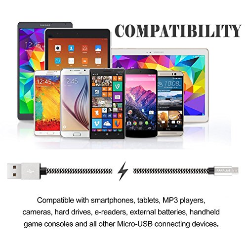 Studio : Farplus Publisher : Farplus Binding : Personal Computers Product Description Premium quality: The well-built aluminum connector resists heat and corrosion and fits every case. The stainless steel connector heads slot in easily and steadily, and won't get loose or fall out from your devices as your normal micro cables. Universal compatibility: Android, Samsung, HTC, Motorola, nexus, nokia, lg, hp, Sony, blackberry, mp3 and more. Charging and sync at the same time. One bag have more choice: The 3ft for the car, the 6ft for the bedside or work, and the 10ft for the couch. Especially, having 10ft cables is super convenient to be able to move your phone around with no space restrictions. With this reasonable price for 3 different length cords, you won't go wrong with it. The Farplus advantage: Fast and easy to reach customer service to solve your problem within 24 hours every cable has been tested to guarantee full compatible with various devices 12 months warranty for every purchase. 0