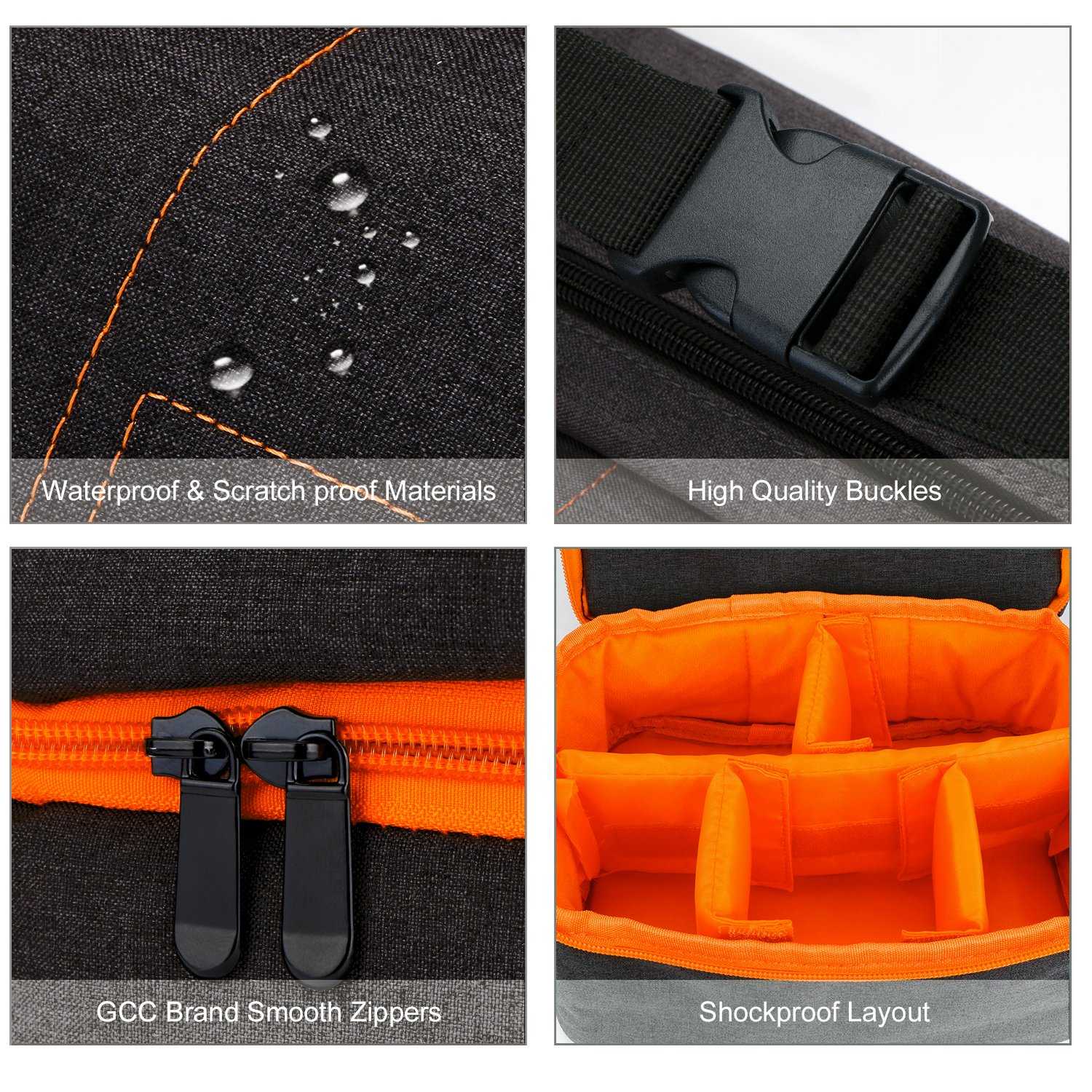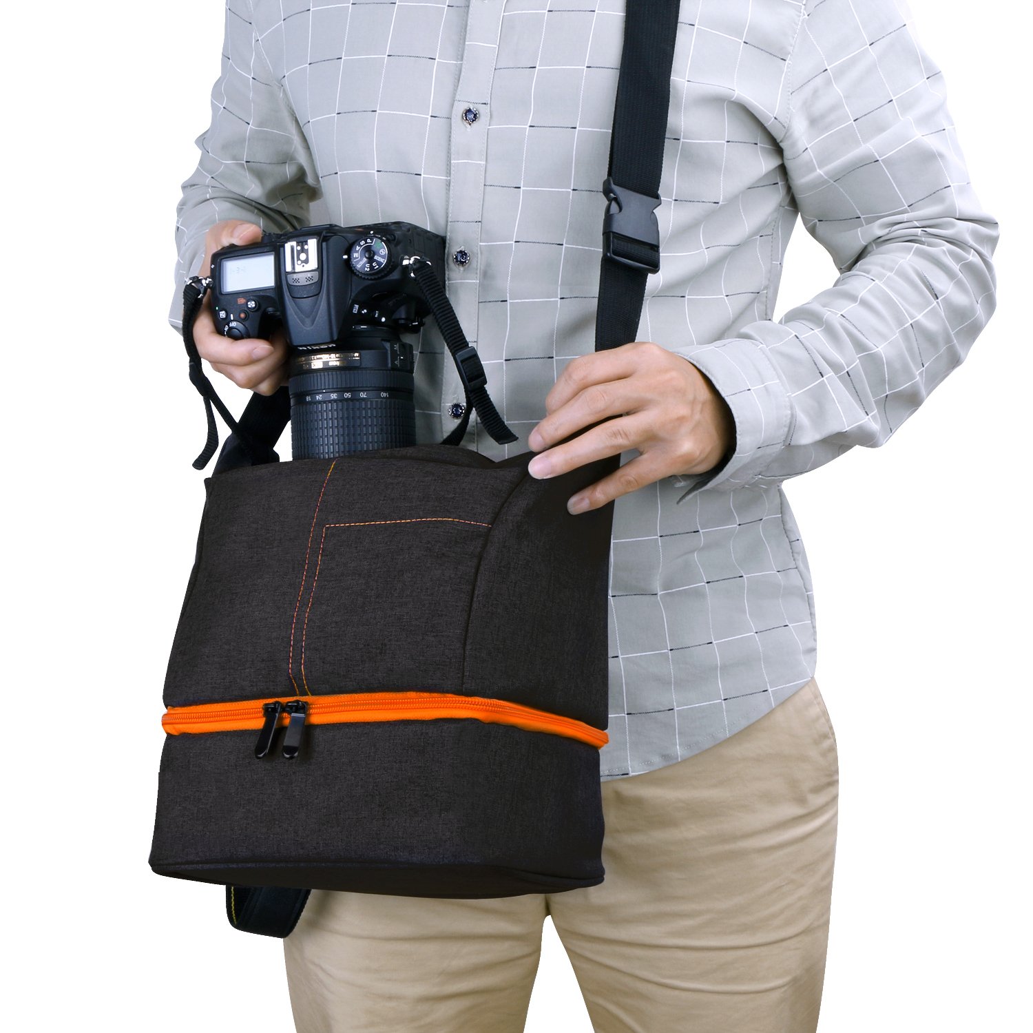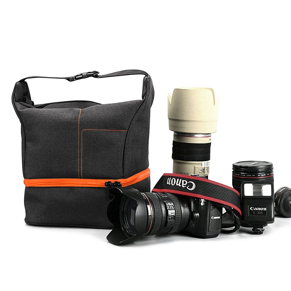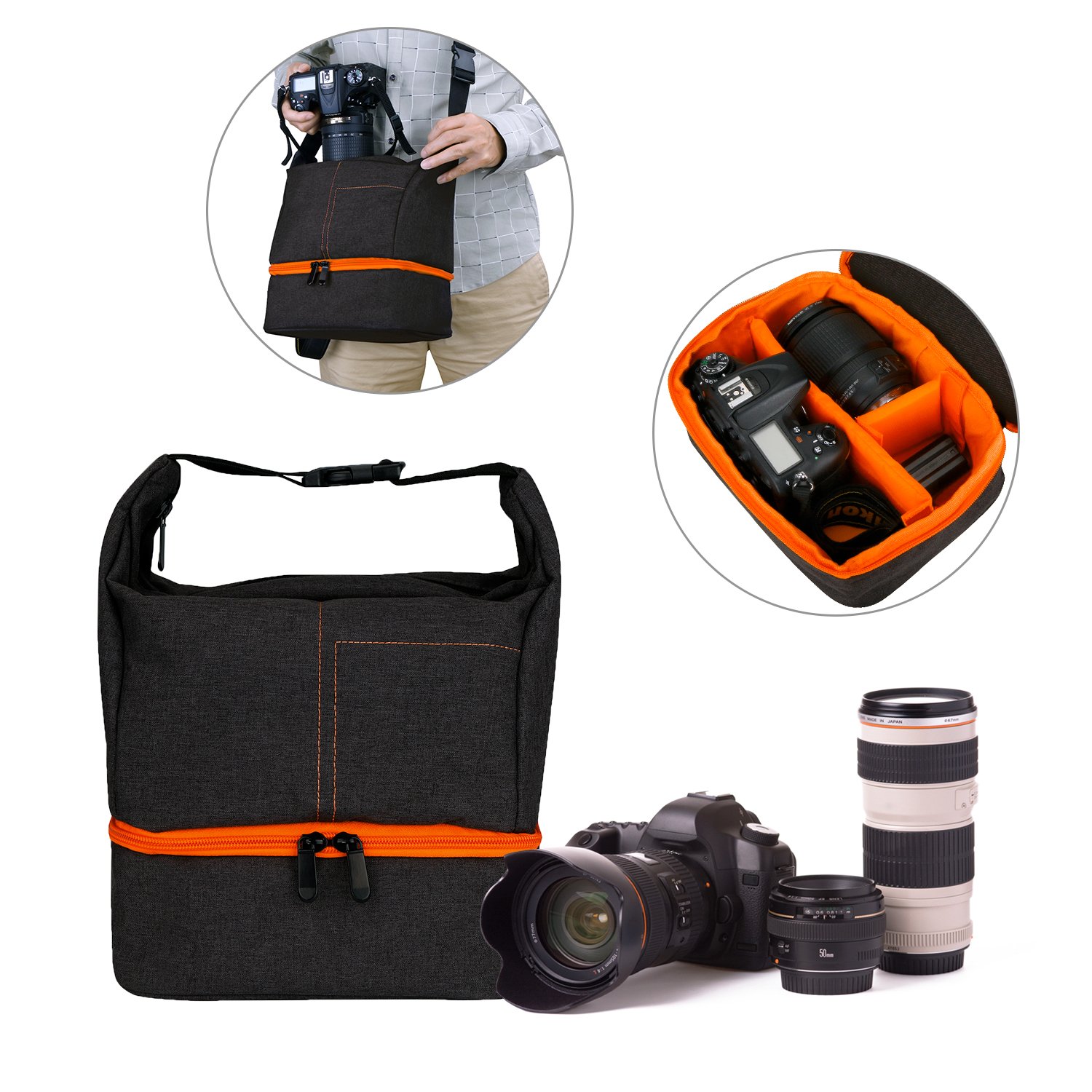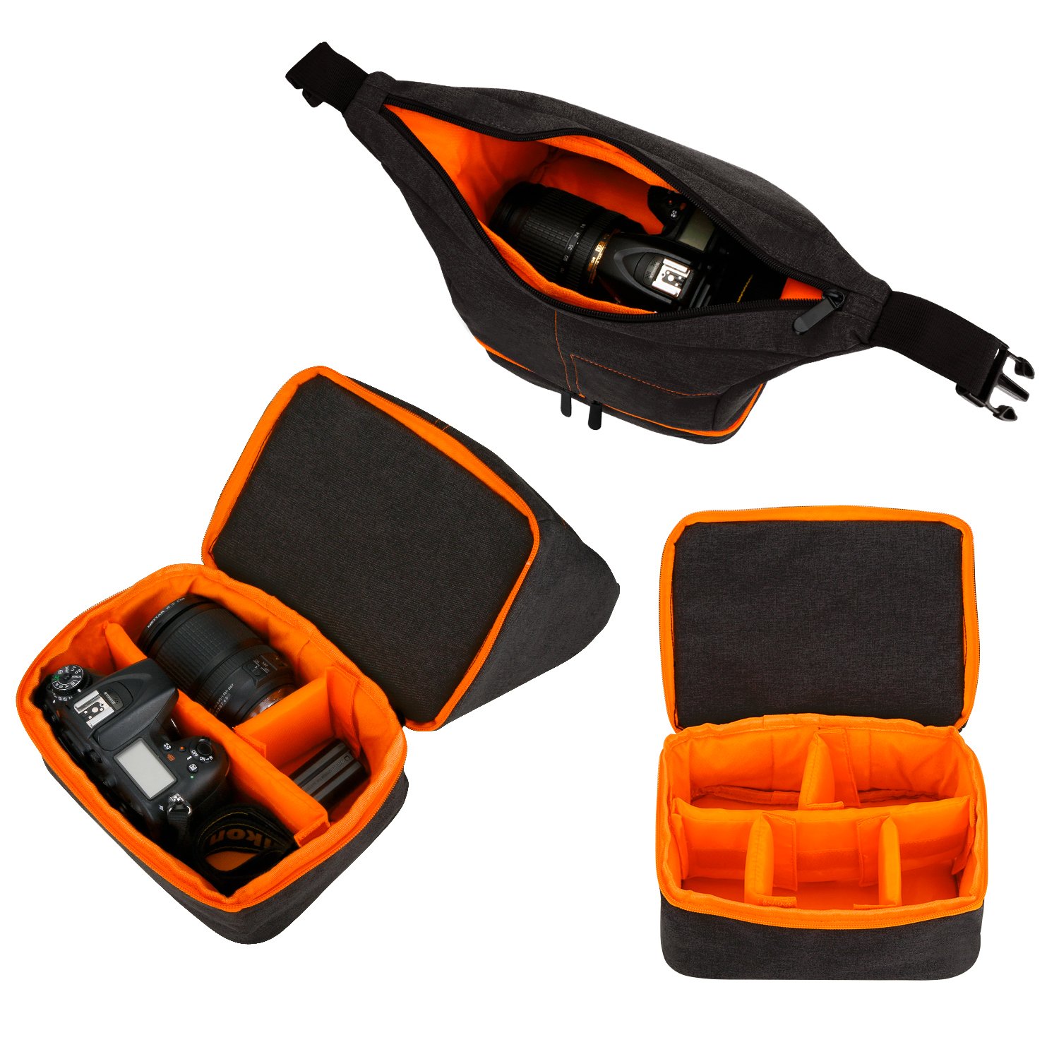 Body with standard lens and telephoto zoom, wide angle zoom, strobe can be stored.