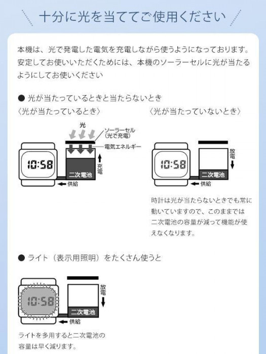 | 仕様 | 男性/紳士用腕時計 適応サイズ(腕まわり):15.0~20.5cm 使用電池:ソーラー充電電池(内蔵) 充電二次電池寿命:約7~10年 |