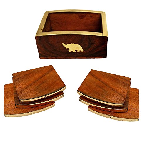 Fine Polished Wooden Square Coaster for Drink Set of 6 with Brass Angles and Holder Bar Dining Accessory (Design 1)