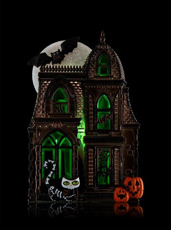 A haunted house with a bat flying by the moon, a skeleton black cat and jack o'lantern pumpkins - everything halloween in one unique Wallflower plug.