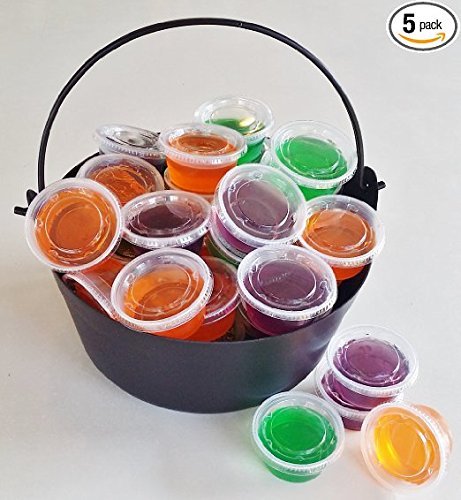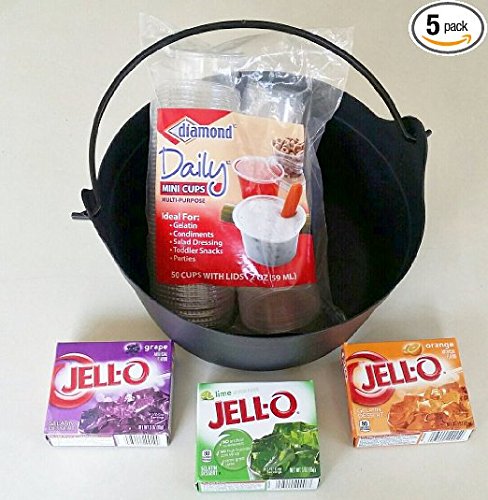 Halloween Jell-O Shot Starter Kit Bundle - 5 Items - 50 Count Plastic Jello Shot Cups with Lids, 2 Oz - Lime Gelatin Jello, Orange Getatin Jello and Grape Gelatin Jello 3 Oz in a Witches Cauldron
