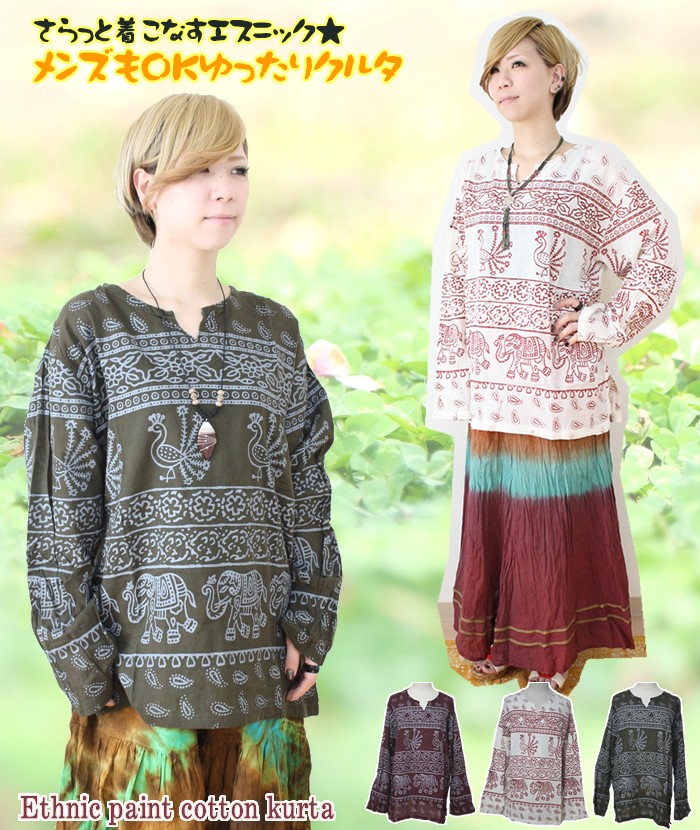 スカート・パンツ・アラジンパンツ・・・どんなボトムにも良く合う着回し度抜群のクルタはエスニックはもちろんデニムジーンズと合わせてカジュアルコーデもOK!!