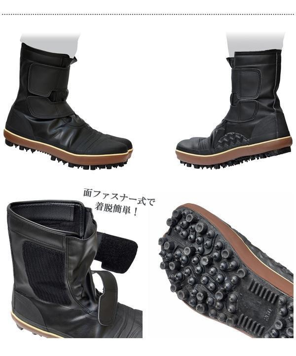 | 仕様 | カラー:黒(ブラウンライン入) 耐水糊引き加工(接地面から高さ約7cm) 靴丈:約20cm 衝撃吸収材入り 鉄芯入り |