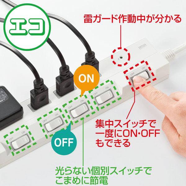 個別スイッチにより機器ごとのON・OFFが可能なので、待機電力がカットでき、節電効果があります。集中スイッチにより、4個口をまとめてON・OFFが可能で、待機電力がカットできます。ホコリ防止シャッターにより、ホコリの侵入を防ぎ、火事などの事故予防に効果的です。落雷による機器の故障を予防する雷ガードを搭載しています。狭い場所でもすっきり配線でき、壁に仮固定できるフック穴付きです。 | |