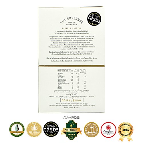 The Ultra Premium Extra Virgin Unfiltered Olive Oil, the Governor (Limited Edition) is bottled under the provisions set forth by PGI and its packaging is done entirely by hand. - An absolutely cold-pressed method is performed accomplishing surprisingly low acidity (0.17%)