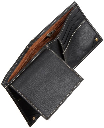 Full grain leather. six credit card pockets. two side pockets. two id windows on removable passcase. billfold with zippered pocket and hidden spare key compartment. reinforced spine. contrast stitching. antique brass finished nail heads. carhartt logo heat stamped on front. black and brown in milled pebble leather.Feature