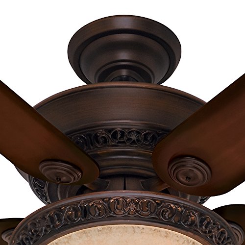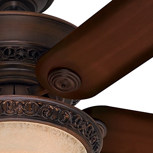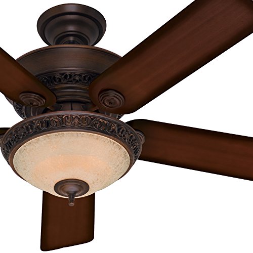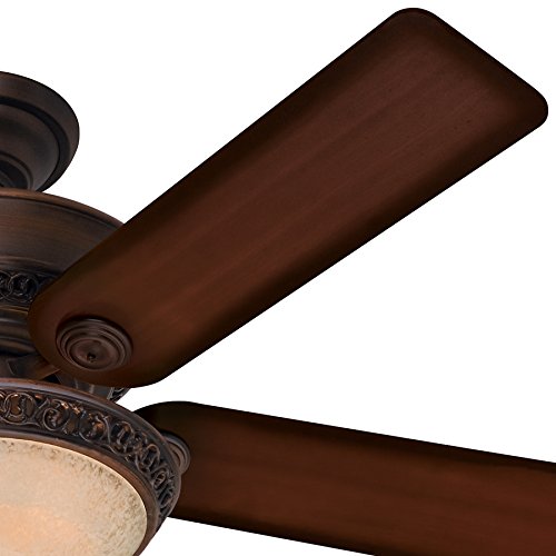 This fan is a part of Hunter's Designer Series, and this ornate fan will bring a new level of class to any space in your home. The cohesive design has high-end finishes, reversible blades, and elegant details on the fan body and glass fixture. This product works well for standard or large rooms with its 52-inch blade span, powerful motor, and bright incandescent lighting.