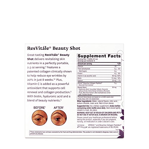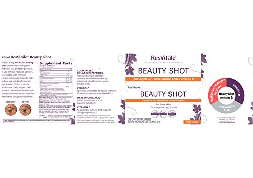 -. Binding : Health and Beauty -. Brand : ResVitáleTM -. EAN : 0858830002561 -. Feature : Collagen With Hyaluronic Acid & Vitamin C / For Firmer Skin / Zero Sugar And 4G Protein / About Resvitále Beauty Shot / Great-Tasting Resvitále Beauty Shot Delivers Revitalizing Skin Nutrients In A Perfectly Portable, 2.5 Oz Serving. Features A Patented Collagen Clinically Shown To Help Reduce Eye Wrinkles By 20% In Just 8 Weeks. Plus, Vitamin C Is Added As A Powerful Antioxidant That Supports Cell Renewal And Collagen Production. With Biotin, Hyaluronic Acid And A Blend Of Beauty Nutrients. -. Label : ResVitáleTM -. Manufacturer : ResVitáleTM -. MPN : 469796 -. PackageQuantity : 1 -. PartNumber : 469796 -. ProductGroup : Health and Beauty -. ProductTypeName : HEALTH_PERSONAL_CARE -. Publisher : ResVitáleTM -. Size : 6 servings -. Studio : ResVitáleTM -. Title : ResVitle Beauty Shot - Peach Mango -. UPC : 858830002561