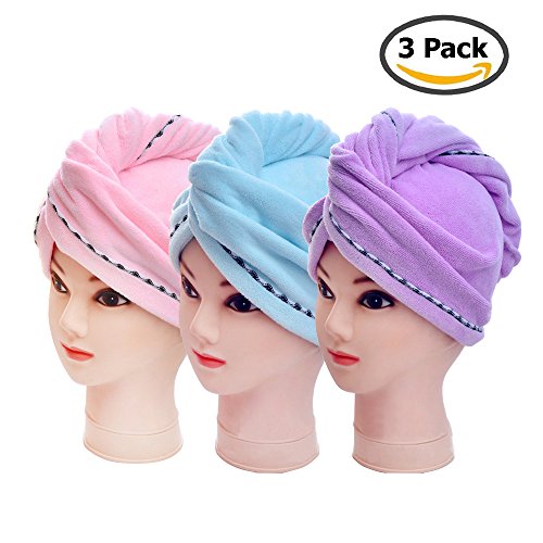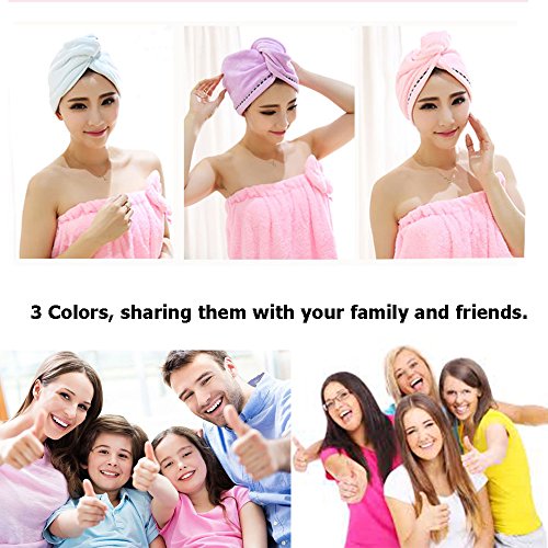 3 Pack Microfiber Hair Towel Wrap BEoffer Super Absorbent Twist Turban Fast Drying Hair Caps with Buttons Bath Loop Fasten Salon Dry Hair Hat Pink Blue Purple