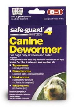 Millions of dogs are infested with a variety of worms annually. Safe-Guard offers a quick and easy broad-spectrum deworming solution, treating and controlling more worms than any other over-the-counter single worming product available. Safe-Guard treats against Tapeworms, Roundworms, Hookworms and Whipworms. Easy to feed granules that mixes into food. Safe-Guard is safe for young puppies over the age of 6 weeks, pregnant female dogs and heartworm infected dogs.