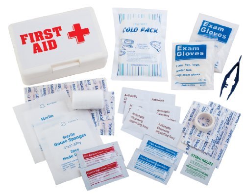 -. Feature : Durable weather resistant case contains: 1 instant cold pack, 10 adhesive strips-3/4" x 3", 1 conforming bandage 2" x 4.1 yds, 1 roll adhesive tape-.5" x 5 yds, 6 antiseptic towelettes / Includes: 1 insect sting relief, 2 triple antibiotic ointment-1/32 oz, 2 first aid cream-1/32oz, 2 pair latex gloves and 1 splinter forceps (tweezers)