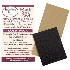 -. Feature : Developed by Pearl Jones so both teachers and students can have a convenient way to mark finger positions on their instrument / These gold precut glossy strips easily lift off and no time is wasted trying to remove their backing / 2" long by 3/16th" wide and fit all sizes of violins and violas / Enough for 6 instruments / Precut felt adhesive squares are included. The squares can be used to mark thumb position placements as well, if desired