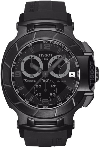 Studio : Tissot ReleaseDate : 2012-02-05 Publisher : Tissot Binding : Watch Product Description Black PVD stainless steel case with a black rubber strap. Black PVD bezel. Black dial with luminous hands and index hour markers. Arabic numerals mark the 6, 9 and 12 o'clock positions. Minute markers. Tachymeter scale around the outer rim. Dial Type: Analog. Luminiscent hands. Date display at the 3 o'clock position. Chronograph - three sub-dials displaying: 60 seconds, 30 minutes and 1/10th of a second. Quartz movement. Scratch resistant sapphire crystal. Solid case back. Case diameter: 45 mm. Deployment clasp. Water resistant at 100 meters / 330 feet. Functions: hours, minutes, seconds, chronograph, tachymeter, date. Casual watch design. Tissot T-Race Chronograph Quartz Sport Mens Watch T0484173705700. 0