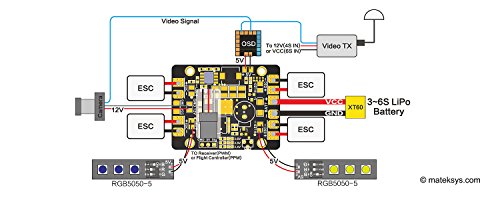 1 Battery input & 4 ESC outputs. Regulated 5V and 12V outputs.LED power indicators (5V & 12V outputs)