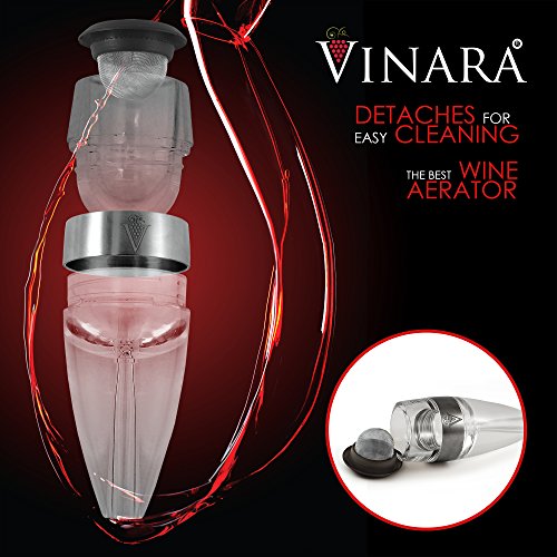 -. Feature : Easy to use and convenient to store- Patented Vinara Wine design speeds up breathing process by instantly aerating in the time it takes to pour a glass of wine / Hold aerator over wine glass and pour wine through for instant 360° MULTI-STAGE Aeration; mixes proper amount of air in right amount of time. Makes the party fun and creates plenty of conversations / Makes a perfect seasonal gift. Fancy Bar Tool. Easily and conveniently enhances the flavor, bouquet, and finish of any wine, makes a better bouquet, Guaranteed! / Passes the FDA food grade material approval. Made of acrylic, and stainless steel the aerator comes with a no-drip stand. / Vinara Wine aerator is the only one that can be easily detached and Cleaned