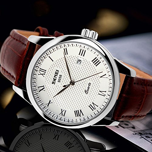 Brand, Seller, or Collection Name:CakCity Part Number:CK9058-WH2 Item Shape:Round Display Type:Analog Clasp:Buckle Case diameter:4 centimeters Case Thickness:16 millimeters Band Material:Synthetic leather Band width:2 centimeters Band Color:Brown Dial color:Silver Special features:Timer Movement:Analog quartz