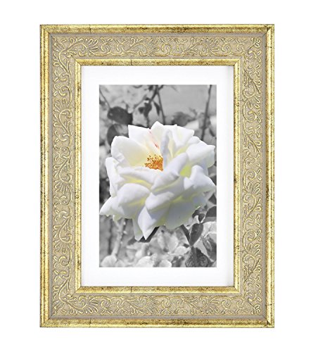 Golden State Art, 5x7 Frame for 4x6 Photo with White Mat, Table-Top Easel Stand, & Real Glass (Light Gold Pewter with Ornate Panel - Vertical + Horizontal)
