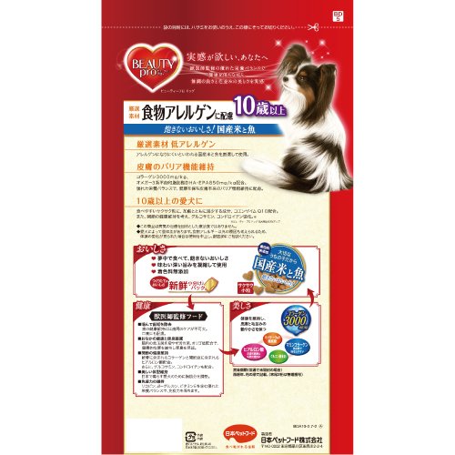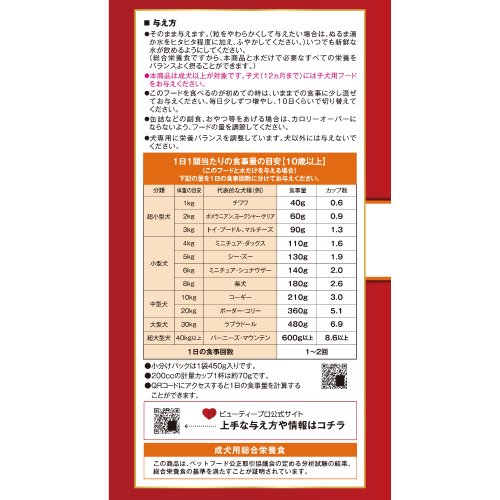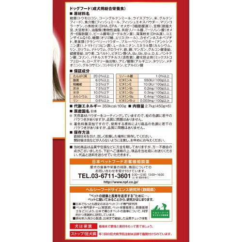 原材料:穀類(トウモロコシ、コーングルテンミール、ライスブラン、米、グルテンフィード)、魚介類(フィッシュミール、フィッシュエキスパウダー、マリンコラーゲン、小魚粉末(DHA、EPA/オメガ-3脂肪酸源))、豆類(脱脂大豆、大豆粉末)、油脂類(動物性油脂、共役リノール酸、γ-リノレン酸(オメガ-6脂肪酸))、ビール酵母(β-グルカン源)、海藻粉末(DHA源)、コエンザイムQ10、糖類(オリゴ糖、エリスリトール)、カゼインホスホペプチド、果実類(クランベリーパウダー、ブルーベリーパウダー(アントシアニン源))、トマト(リコピン源)、L-カルニチン、ミネラル類(カルシウム、リン、カリウム、ナトリウム、クロライド、鉄、銅、マンガン、グルコン酸亜鉛、硫酸亜鉛、ヨウ素、コバルト)、ビタミン類(A、B2、B6、B12、D、E、パントテン酸、コリン)、バチルスサブチルス(活性菌)、酸化防止剤(ミックストコフェロール、ローズマリー抽出物)、アミノ酸類(アルギニン、タウリン、メチオニン)、グルコサミン、コンドロイチン、ヒアルロン酸