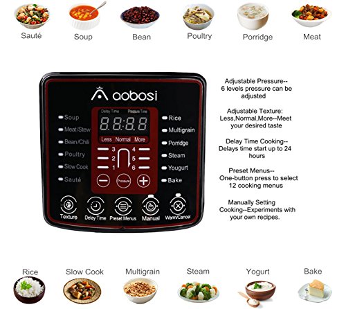 【BUILT-IN 12 COOKING MENUS】---Soup, Meat/Stew,Bean/Chili,Poultry,Slow Cook,Saute,Rice,Multigrain,Porridge,Steam,Yogurt,and Bake. Almost common dishes can be cooked in our digital pressure cooker. Retains flavours, nutrients and aromas with sealed pressure cooking. Easily Prepare tasty meals with this Aobosi electric cooker.