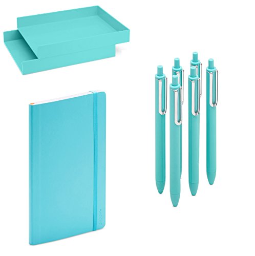 Poppin Colorful Office Desk Accessory Writing Gift Collection Set with Front Load Stackable 2 Tier Letter Trays, Medium Size Soft Cover College Ruled Notebook Paper and Retractable Gel Luxe Pens Aqua