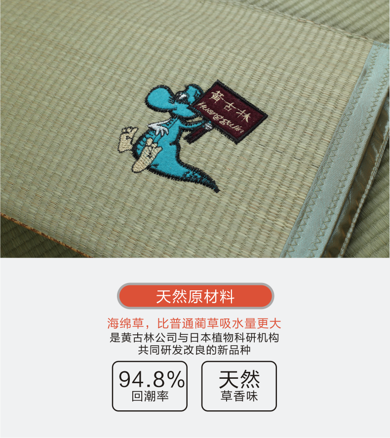 | 成份与含量 | 表面:纬:100%草(海绵草);经:100%聚酯纤维; 背面:100%聚酯纤维 填充物:茉莉花干 蔺草颗粒 |