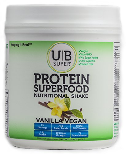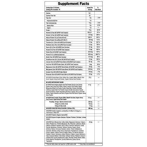 -. Binding : Health and Beauty -. Brand : UB Super -. Feature : Plant-based proteins from yellow pea, Salba® chia seeds, h.e.m.p and quinoa / Rich phytonutrients and antioxidants from the highest quality globally sourced superfoods found in nature / Vitamins your body needs each day to thrive / Fulvic minerals/acid to support complete body health / Pre- and probiotics with digestive enzymes for digestive support -. Label : UB Super -. Manufacturer : UB Super -. ProductGroup : Health and Beauty -. ProductTypeName : HEALTH_PERSONAL_CARE -. Publisher : UB Super -. Studio : UB Super -. Title : UB Super Protein Superfood Nutritional Shake Dietary Supplement, 15 Servings