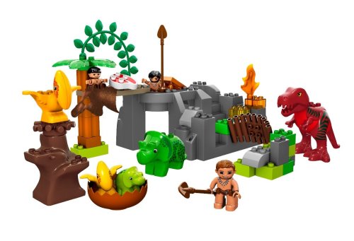 -. Feature : Includes two cavemen and cave-boy, plus a cave that comes complete with cavemen drawings / Dinosaurs include a parent and baby triceratops, parent and baby Pteranodon and a T-Rex with snapping jaws / Includes fishing pole, canoe and a fish for the cavemen to go fishing / Jungle has a tree, vine and a drawbridge that flips over / Contains 52 pieces