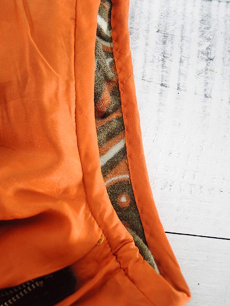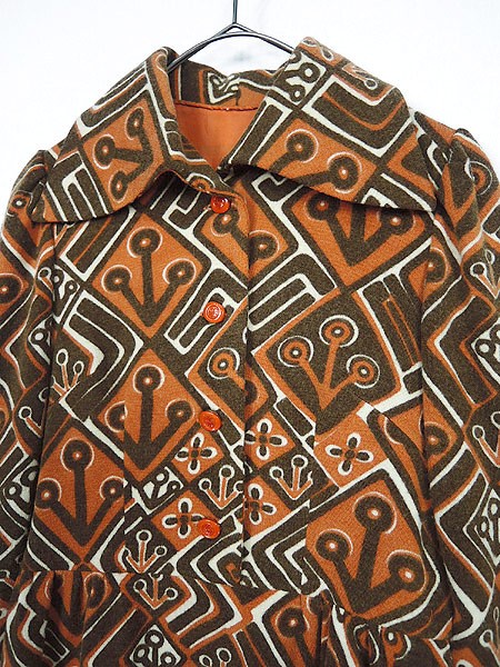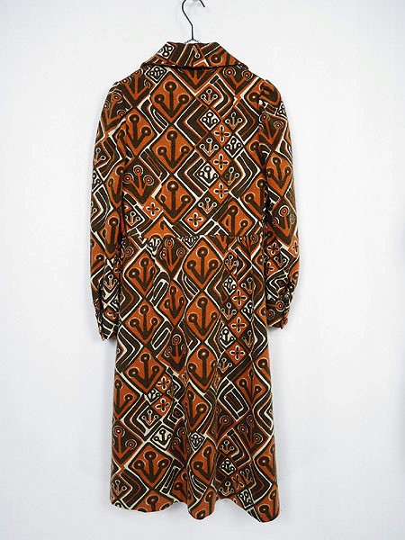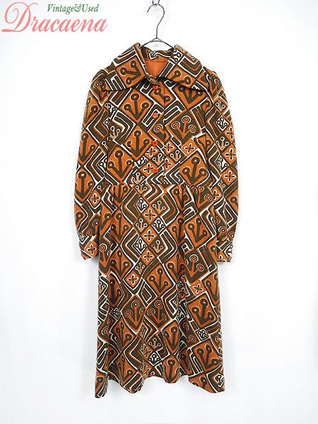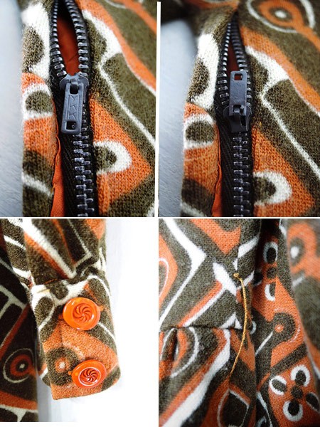 裏地あり(袖裏はなし)、裾はテープの上からの始末。サイドジップはYKKのピンロックジップ。花や植物のモチーフのような柄に茶、オレンジのレトロカラーがマッチしている素敵なシャツワンピです。アンティークボタンも◎。