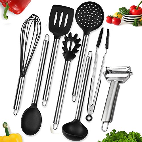 -. Title : Kitchen Utensils 8 Piece Cooking Utensils Nonstick Utensil Set Silicone and Stainless Steel Kit For Pots Pans - Ladle Spoon Serving Spoon Turner Spatula Food Tongs Whisk Skimmer Pasta Server Peeler