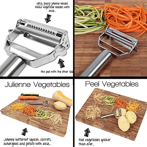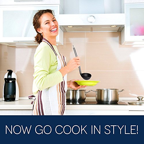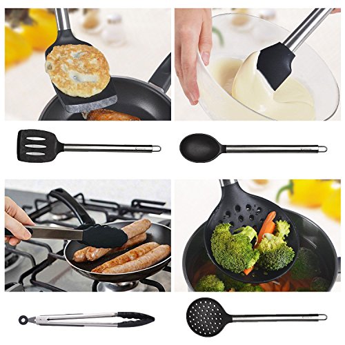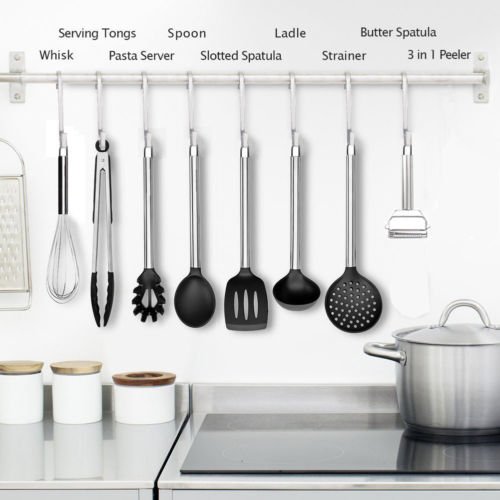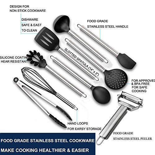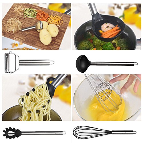 -. Feature : 8 Pieces Kitchen Utensil Set - The complete cooking tools set combined with a Ultra Sharp Stainless Steel Dual Julienne & Vegetable Peeler (bonus). With it, preparing, peeling, cooking, everything gets done at a lightning fast speed. The obvious benefit is that cooking will be easier, faster, smarter and much more enjoyable. Set includes Ladle Spoon, Cooking Spoons, Turner Spatula, Food Tongs, Whisk, Ladle Strainer, Pasta Server, Vegetable Peeler / Non-Stick and Non-Scratching: The heat resistant silicone of the cooking utensil sets makes cooking safe and easy while ensuring maximum protection for your kitchenware. The silicone utensils set withstand up to 480°F. The silicone heads of the nonstick cooking utensils set don't scratch your expensive non stick pans & pots / Dishwasher Safe and Easy to Clean: These silicone kitchen utensils are incredibly easy clean and can be either hand washed or tossed in the dishwasher for the ultimate in convenience. Rinse with warm soapy water or simply place them in the dishwasher. Fits perfectly into all kitchen types and designs / Premium Quality: The kitchen utensils set made of food grade safe materials with superior quality. FDA approved, BPA free and latex free. Has durable silicone heads & strong stainless steel handles with hanging loops for easy storage. Professionals, enthusiasts and novices will enjoy the high quality of these kitchen tools / COOKS YOUR DISHES PERFECTLY WITH COMFORT or YOUR MONEY BACK. If you are not completely satisfied with the kitchen utensil set, just let us know and we will refund every penny (or replace the set of kitchen utensils, if there is an issue). Our Kitchen Kit is a unique and thoughtful present for you, your family and friends for a Mother's Day, Christmas, Birthday, Housewarming, Weeding, Anniversary