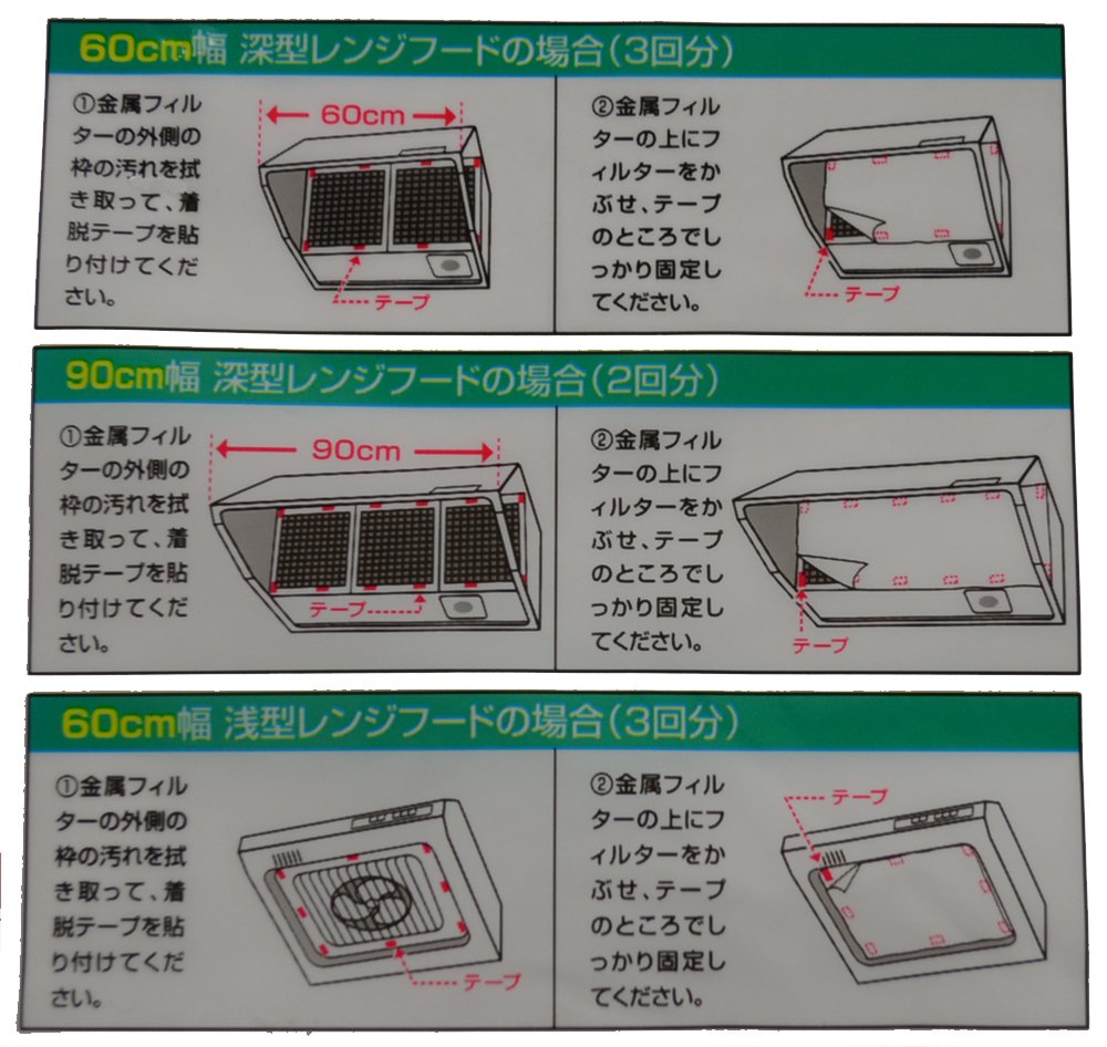 ● Please cut with scissors according to the opening size of your range hood. ● Available models (deep type): 60 cm 3, 75 cm 2, 90 cm 2, double-sided metal filter type 2 times ● Available models (