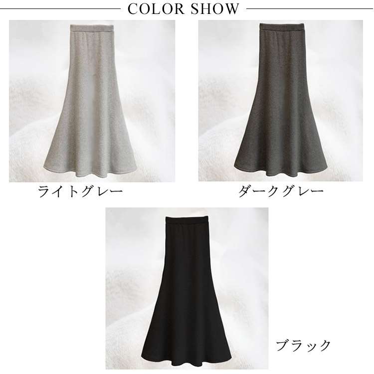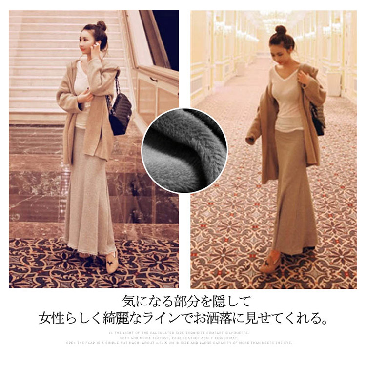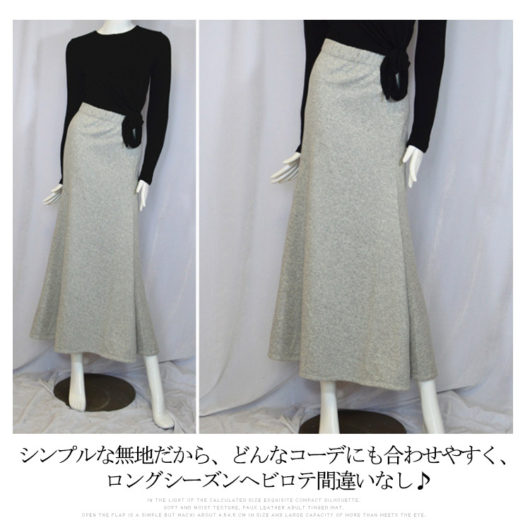 | 秋冬シーズンに大人気なマキシ丈スカートです。厚手の裏ボア素材を使用し、真冬でも寒くないのは人気の秘密。気になる部分を隠して女性らしく綺麗なラインでお洒落に見せてくれる。シンプルな無地だから、どんなコーデにも合わせやすく、ロングシーズンヘビロテ間違いなし♪ | |