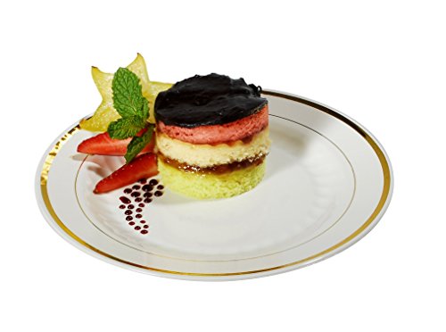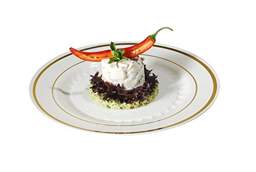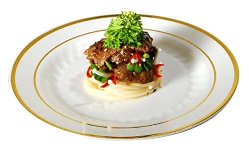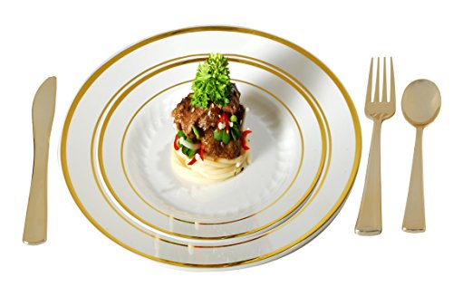 Plastic Plates Disposable-Silverware Combo | Elegant Gold Rimmed Dishes and Plastic Gold Cutlery Dinner Service | Service for 24 (129-piece Bulk Set) IVORY / GOLD