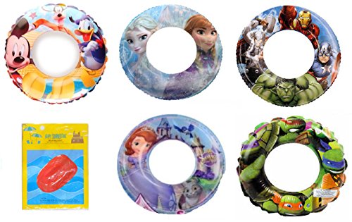 Studio : theBDstore Publisher : theBDstore Binding : Toy Product Description Kids will love splashing in the pool with their favorite Disney and Nickelodeon characters. In this 5 swim ring set, The ladies from Frozen and the Mutant Ninjas will challenge the Avengers, Mickey and Sofia for supremacy of the waves! Set comes exactly as pictured with the Teenage Mutant Ninja Turtles, Frozen's Elsa Anna, Mickey Mouse, Sofia the First, and the Avengers. Also included in the Pool Party Package is a large RED inflatable boat. 0