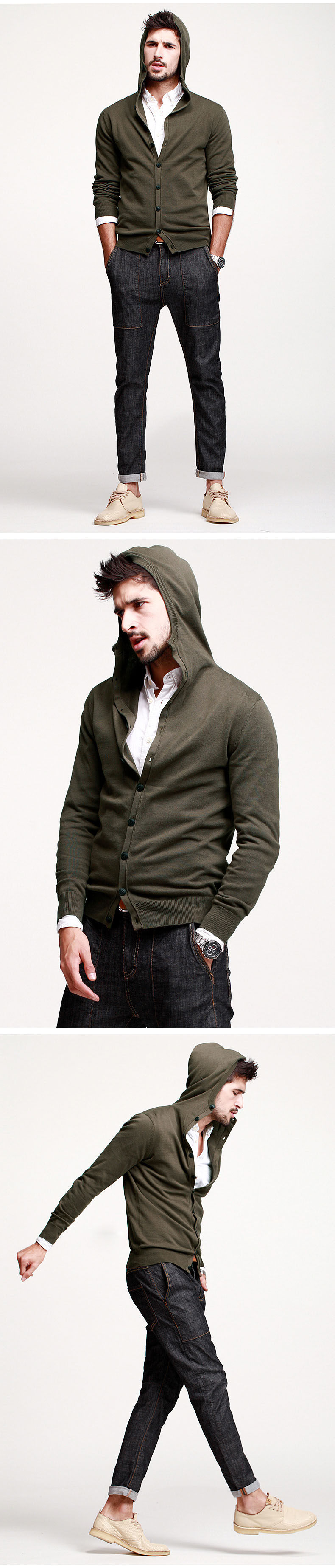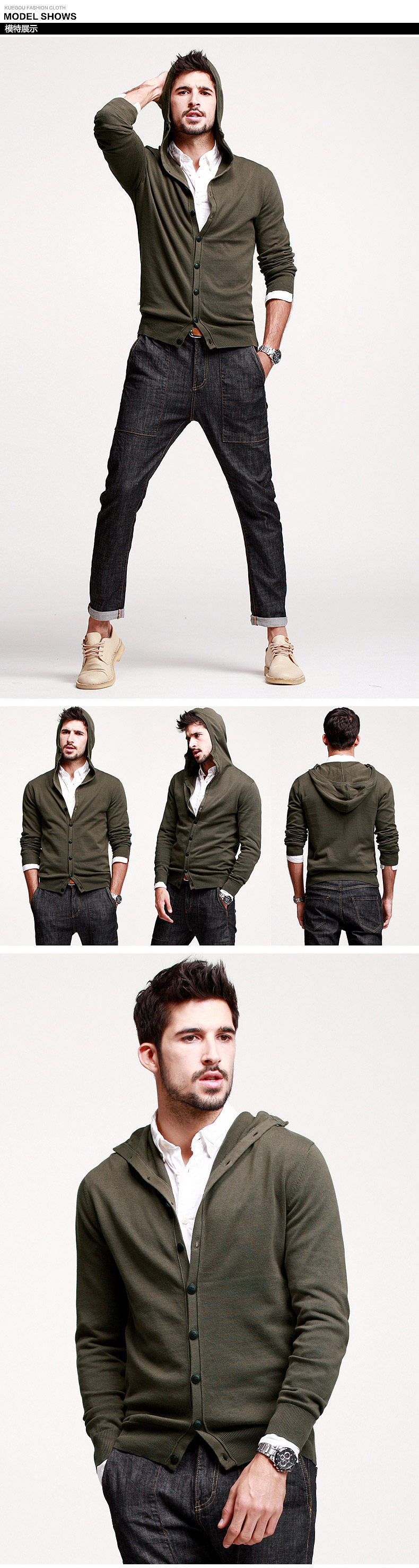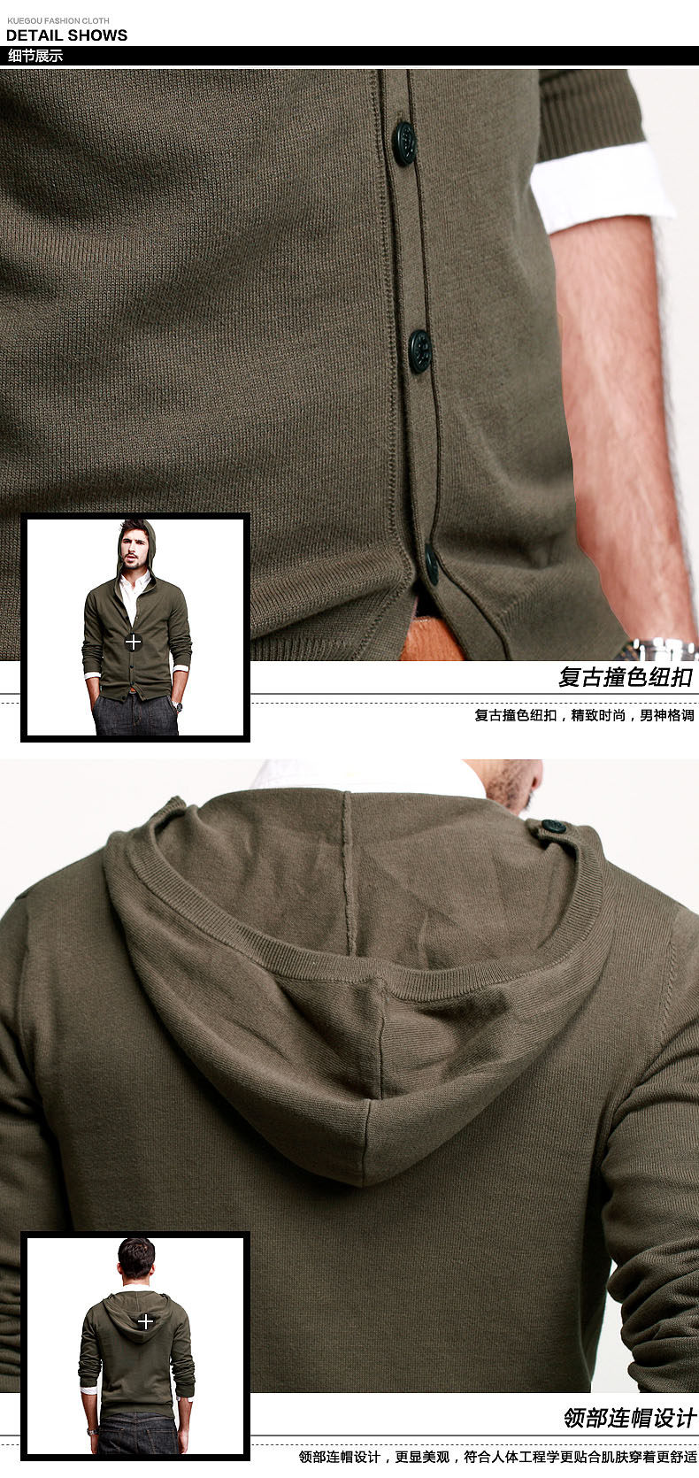 ②设计:特色领部连帽设计,烘托风雅暖男形象,复古撞色纽扣,男神格调,袖口松紧潮流时尚,彰显时尚干练硬朗气息,品质一流,不易脱线。