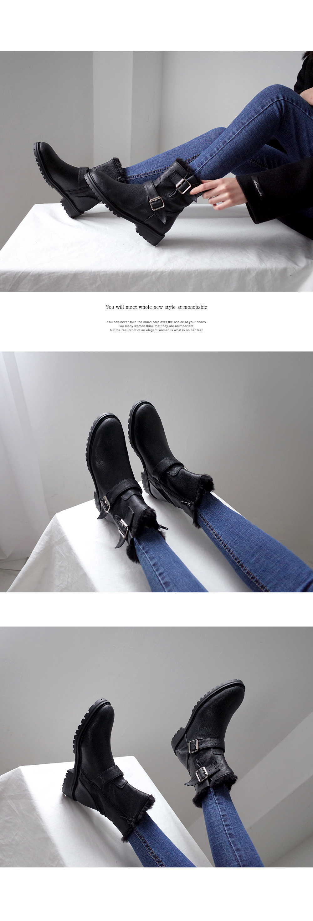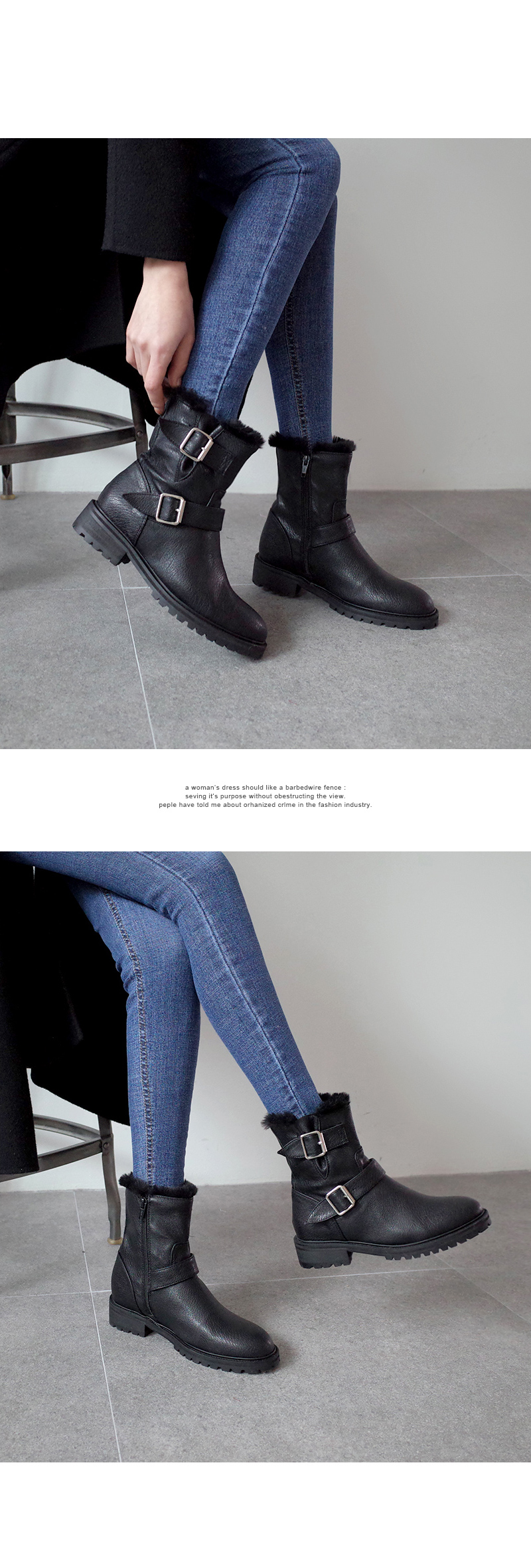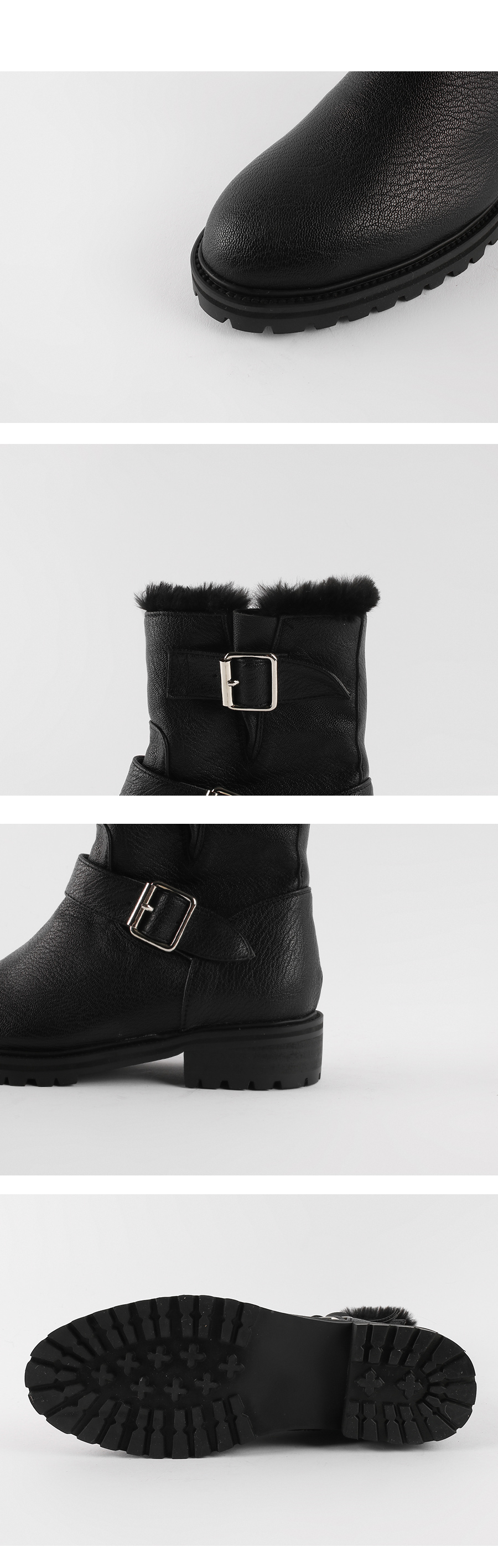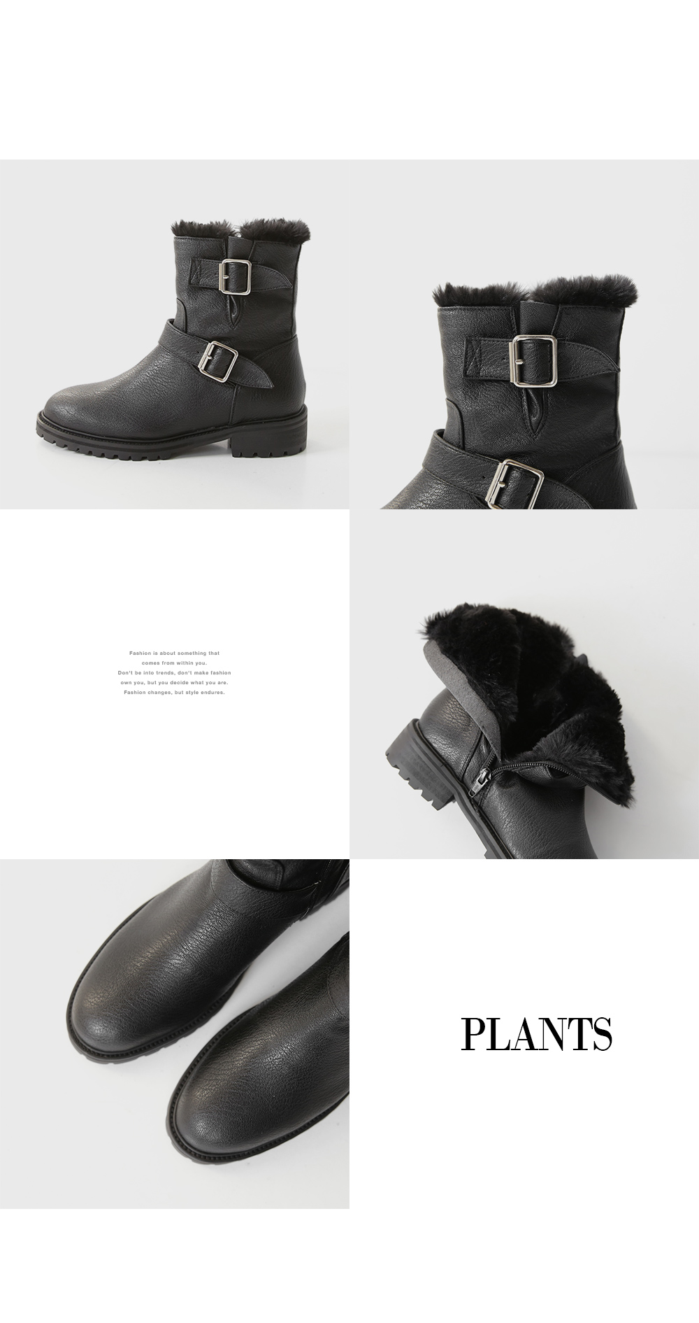 발목 퍼 장식으로 따뜻하게 착화되고 투 버클 스트랩이 심심치 않은 포인트를 줍니다.